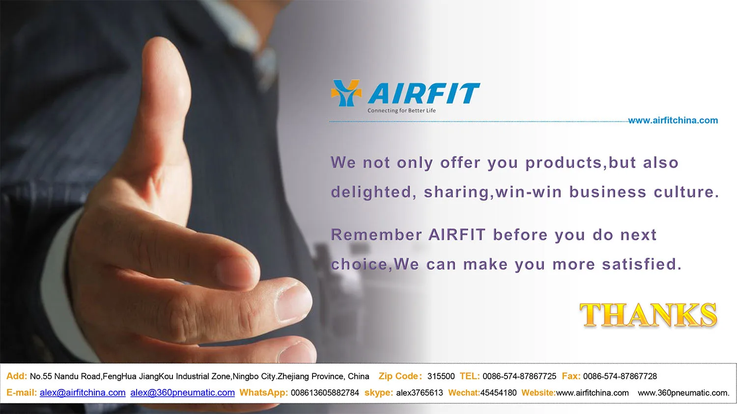 A1. We are a leading manufacturer of all pneumatic products. Welcome to visit our factory at any time.