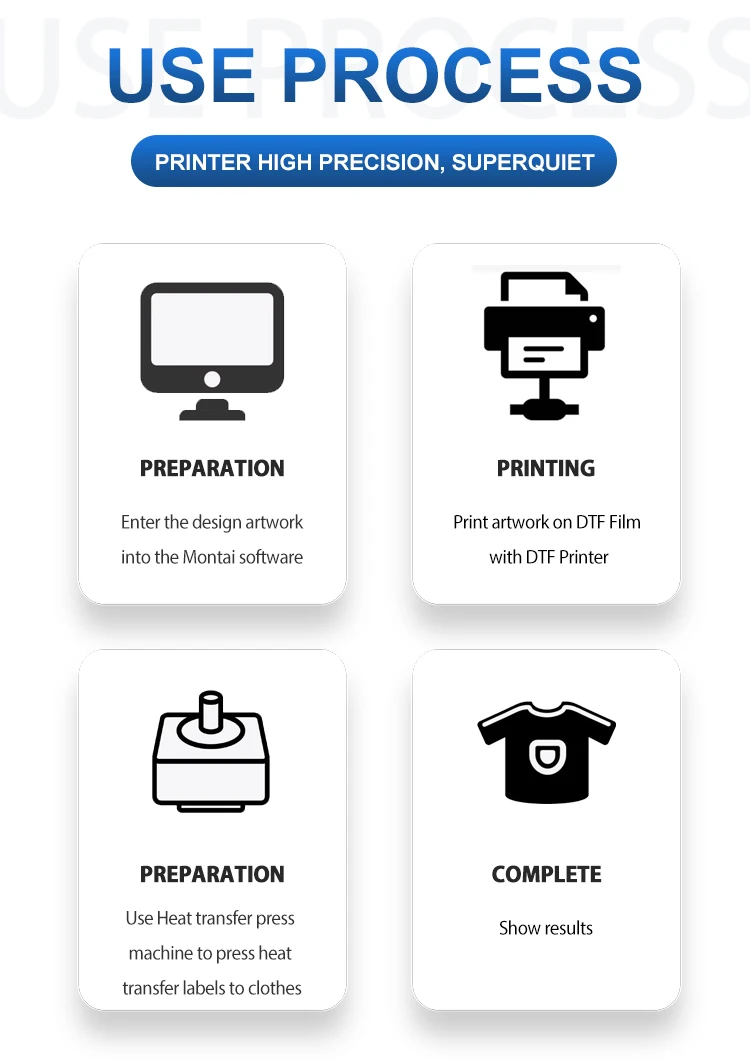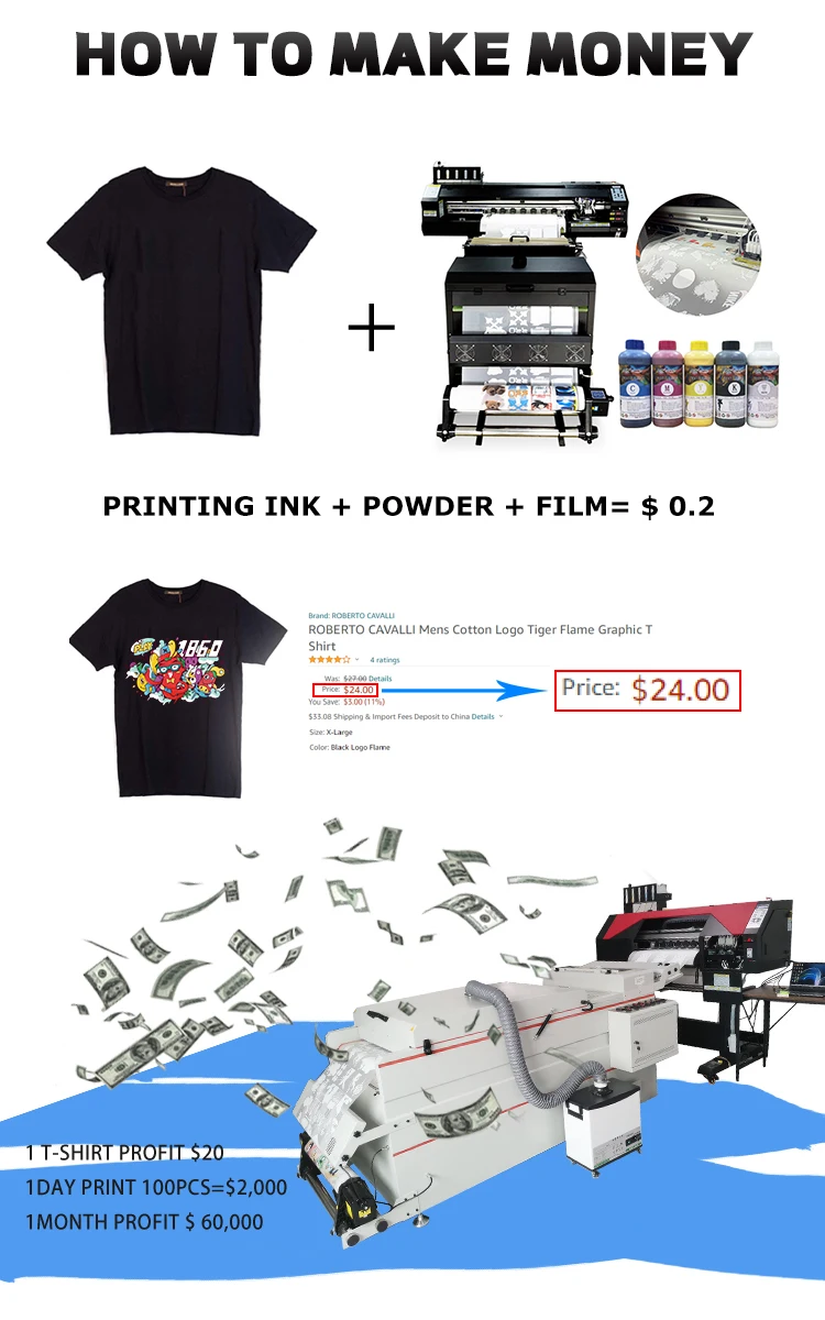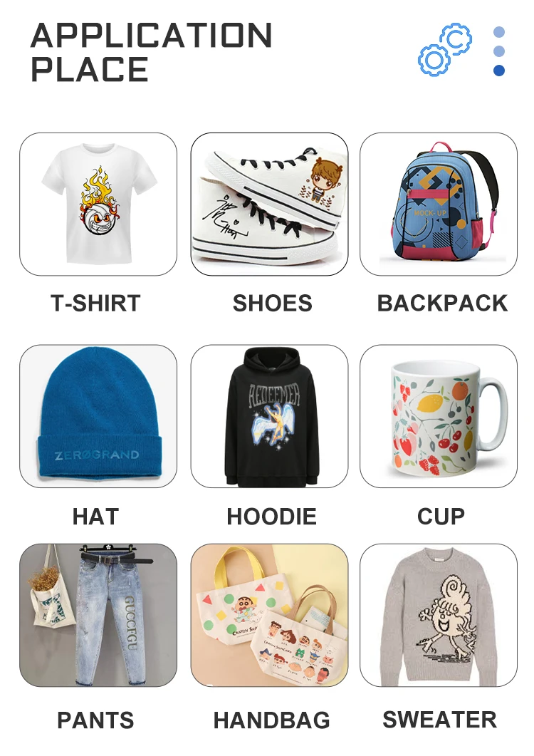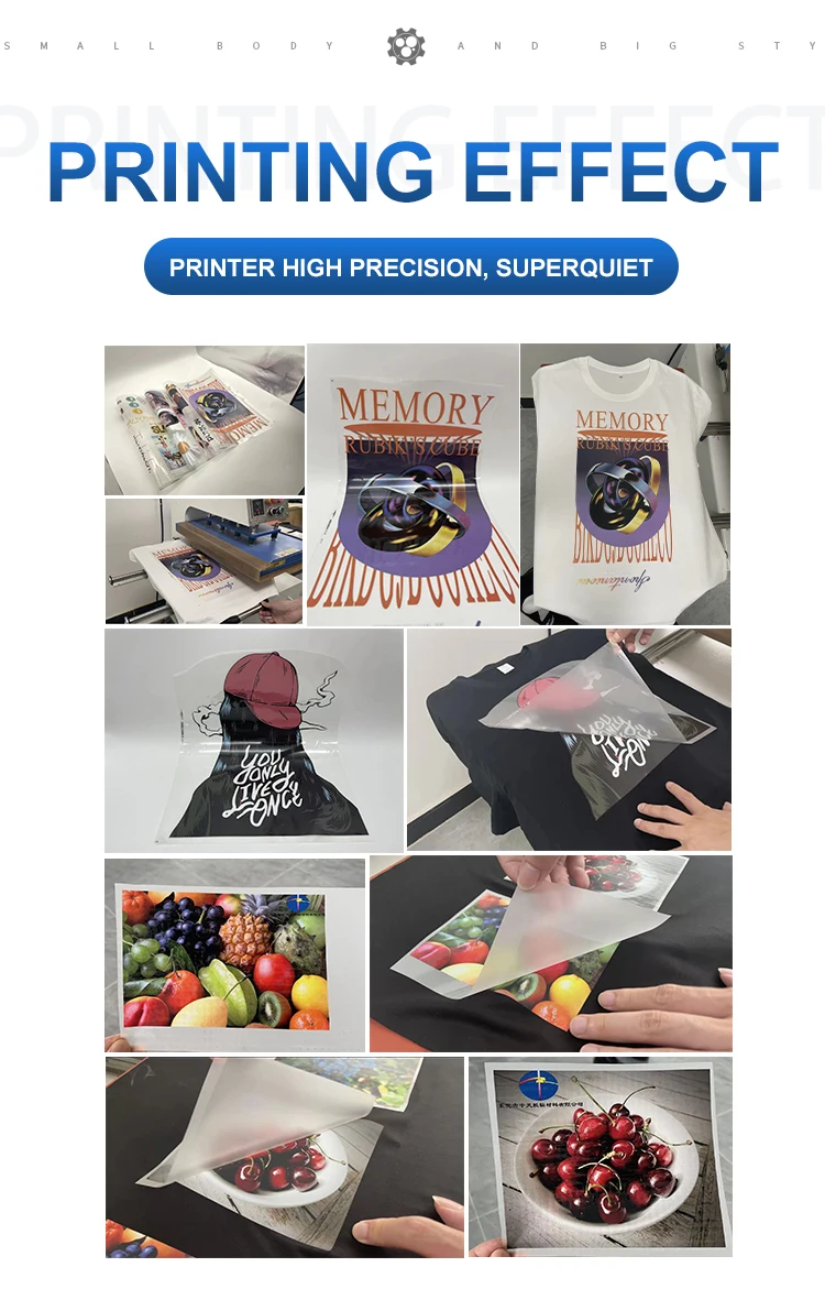 There is no need for the boarding fee of the traditional model; The accuracy is 98% higher, and branded products can be created;High production speed and high time efficiency; The print head is Epson I3200, which can automatically clean the machine head without clogging and continuous ink; Stainless steel fixed, very stable, the speed and quantity of ink are stable Powder shaker:the drying area is heated evenly, with a fume extraction system, timely sewage and exhaust, and clearer picture quality