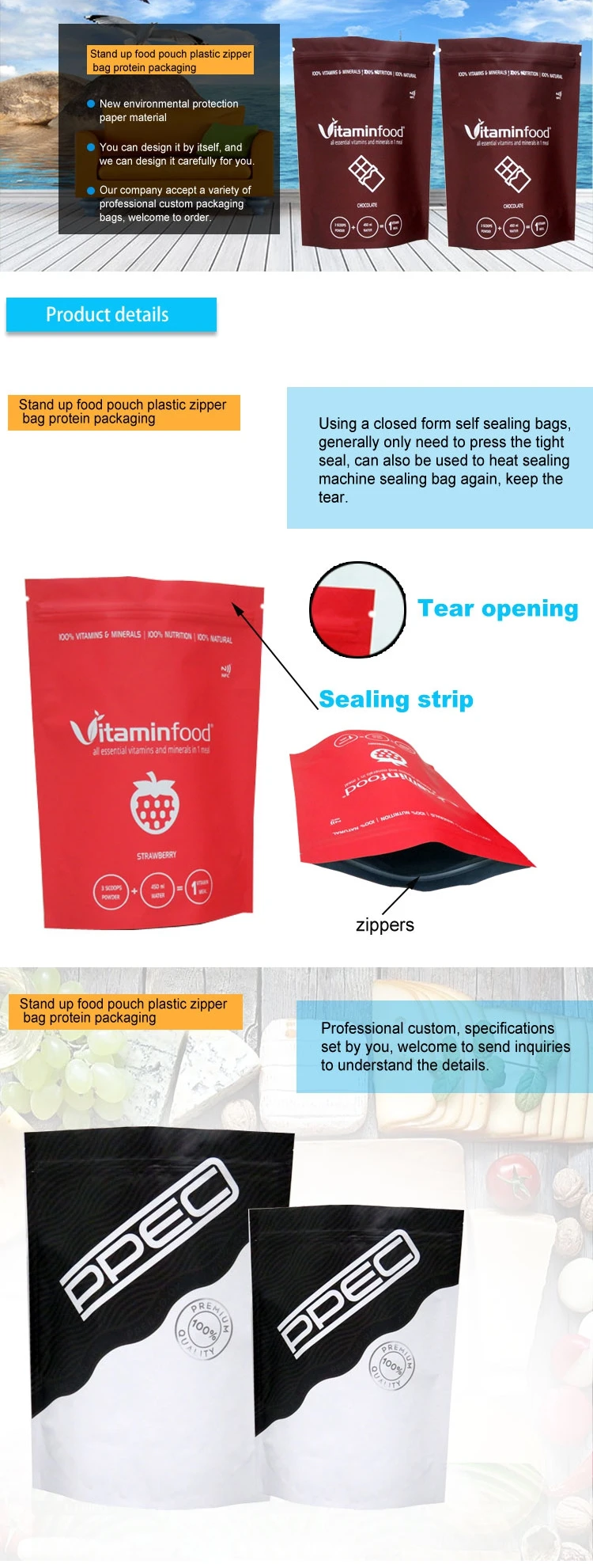 Bag style | Zip Lock Bag , Aluminum Foil Bag , Stand Up Pouch , Spout Pouch , Gusset Bag , Middle seal pouch , Four Side Seal Bag , Eight Side Seal Bag , Craft Paper Bag , Flat Bottom Bag etc |