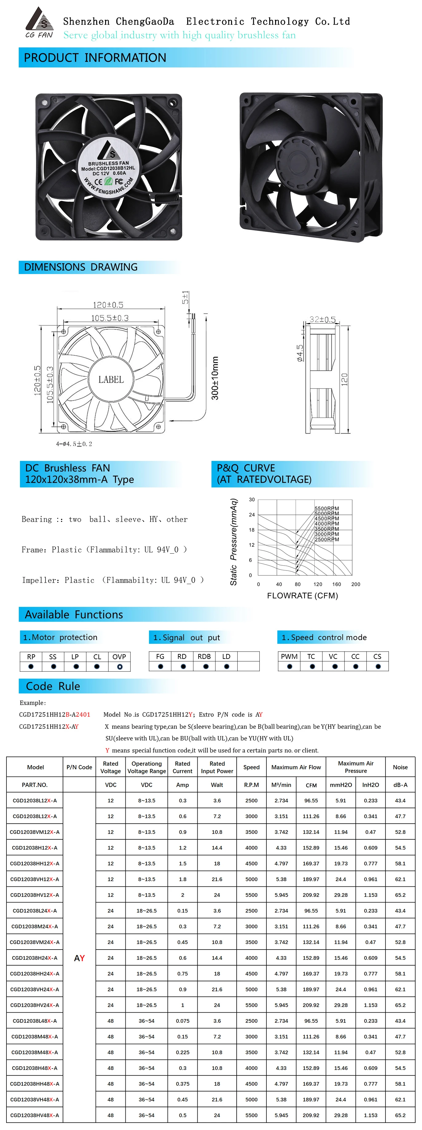 Fan Manufacturer 120mm 120*120*38mm 12038 Aluminum Frame 12V 125x DC Brushless Axial Fan 300CFM