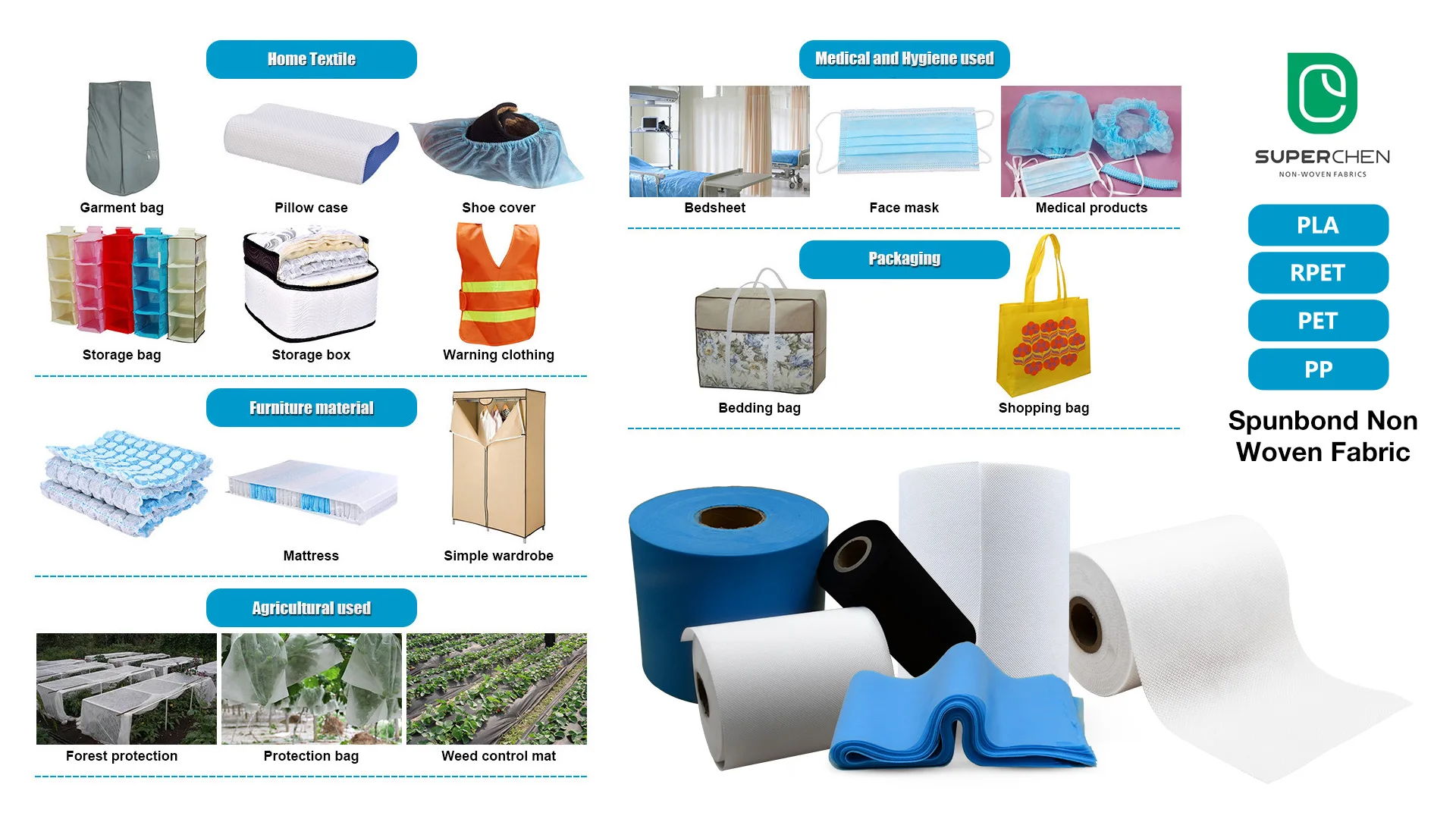 Application | 1.Medical:face mask,disposable medical product,disposable bedsheet,surgical gown,protective clothes,operation cover,cap,shoe cover,Medical curtains and so on. 2.Home Testile:Shopping/storage bags,table cloth/wall paper,Furniture/spring mattress/filter material,Flower packing material and so on 3.Agriculture:agriculture covers,crop protection cloth,agriculture weed contol fabric,banana protection,plat/flower cover and so on. 4.Sanitary and Health:Baby&Adult diaper,Feminie pad. |