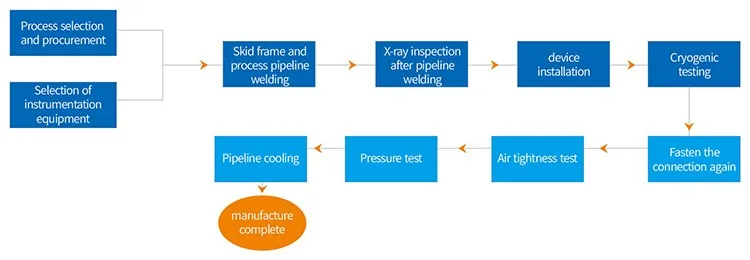 Based on the particularity of low temperature and related properties of LNG media, LNG skid-mounted instruments and equipment are integrated into a metal framework. The manufacturing steps are complex and are mainly divided into the following manufacturing steps: