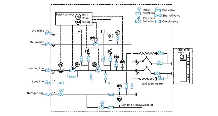 There are many process pipelines for LNG loading and the process flow is relatively complicated. The main pipelines are: loading line, return line, cold circulation line, bleed line, nitrogen line and so on. The flow chart is as follows: