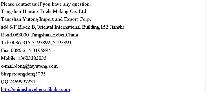 Tangshan Yutong Import and Export Corporation established in 1992. We have twenty years export experience.We are specialized in variety kinds of shovels. Our products mainly export to Eurpoe,USA,Australia,SOuth America,Middle east,Africa.... Our turnover has been over 20 million. |