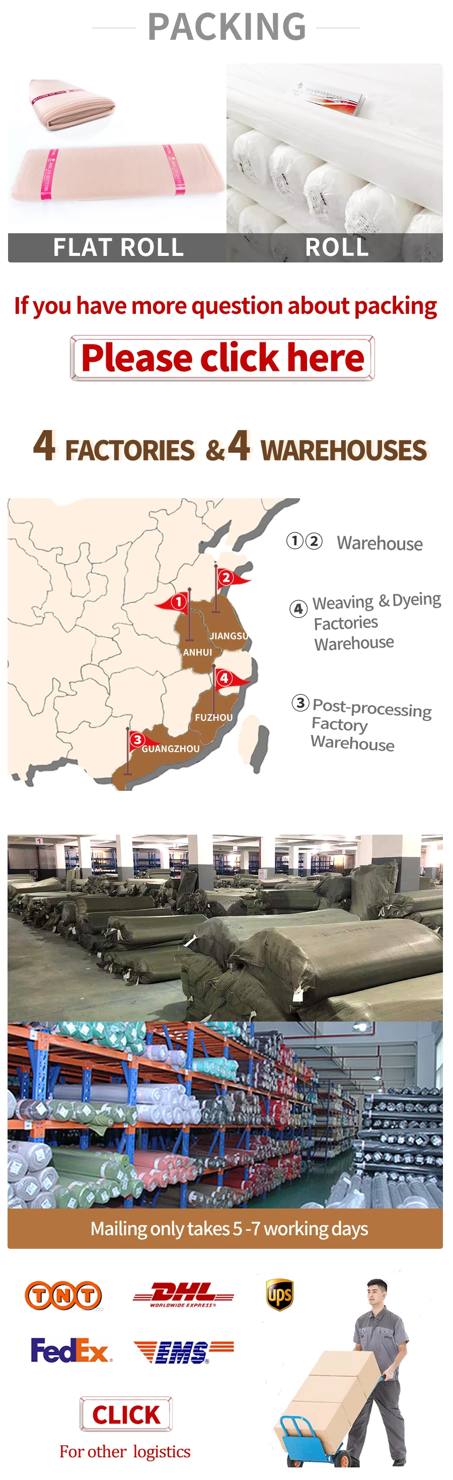 1. Fabric will be rolled on a carton tube and wrapped in a polybag.