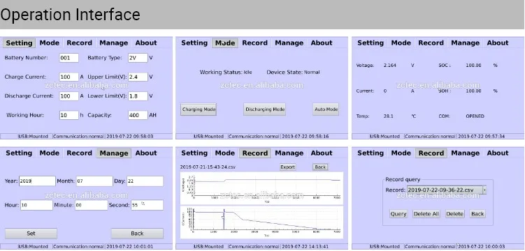 Feature: 1.Three functions of charging, discharging and activation. It can used online and offline; 2.Parameters such as charge-discharge current, upper and lower limits of charge voltage can be set freely; 3.Charging: adopt standard three stage charge method “constant current, voltage limiting →constant voltage, current limiting →floating charge”; 4.Discharging: according to set discharge, it carries on fixed constant-current discharge; 5.Activation: adopt the unique “impulse type” activation mode, effectively eliminate the sulfuric acid phenomenon of storage battery, maximum recover battery performance; 6.2V/12V compatible design; 7.Use LCD screen display in English, operation is simple and easy to use; 8.All the parameters are displayed in real time and automatically stored in the instrument, no lost when power off; 9.Multiple self-protection functions: reverse connection, fault connection and over-temperature; 10.It’s small and light and can be carried by one person, easy to use, safe and reliable. Product Parameter | ||