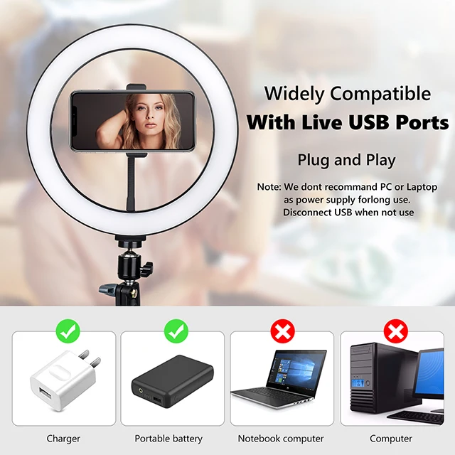 【Convenient USB Power Supply】Convenient USB power supply without any batteries needed. Works well with multiple devices that support USB port like PC, notebook, mobile power, mobile phone plug without needs of charging, plug and play. Enjoy LED ring light at any time in indoors and outdoors