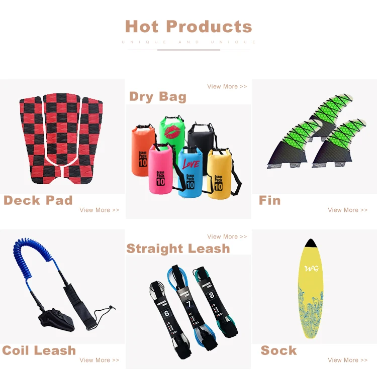Our company is mainly specialized in surf accessories,such as surfboard socks,bags,leashes,Waterproof Bags,Traction Pads/EVA Pads,Beach Products,Fins/Hydrofoil,Paddles,etc.