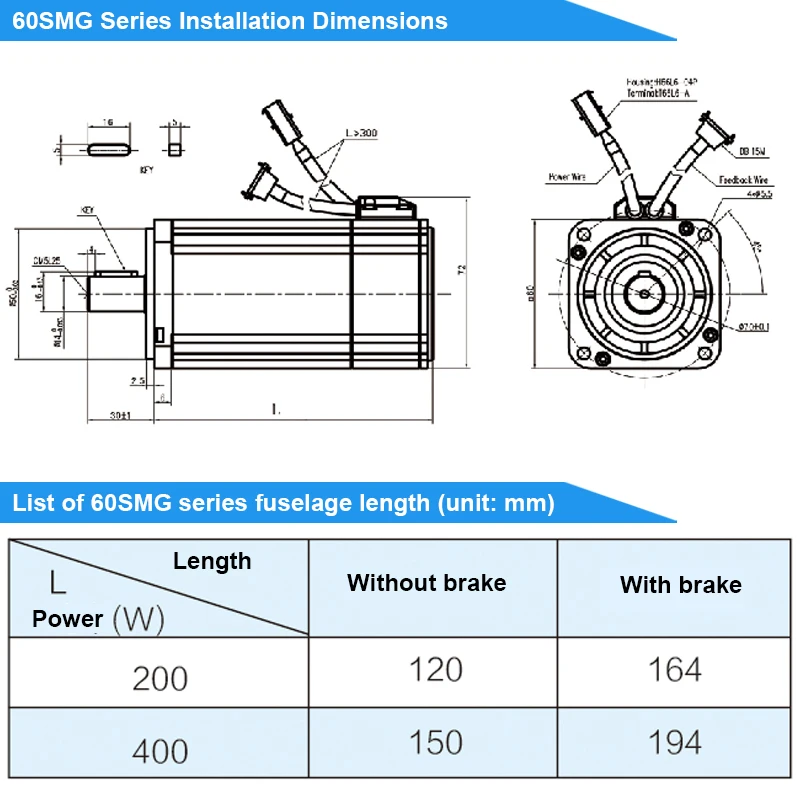 Servo motor model | Motor Length L(mm) | 60SMG0220306ENC-XX 60SMG0220306ENL-XX | 60SMG0240306ENC-XX 60SMG0240306ENL-XX | ||