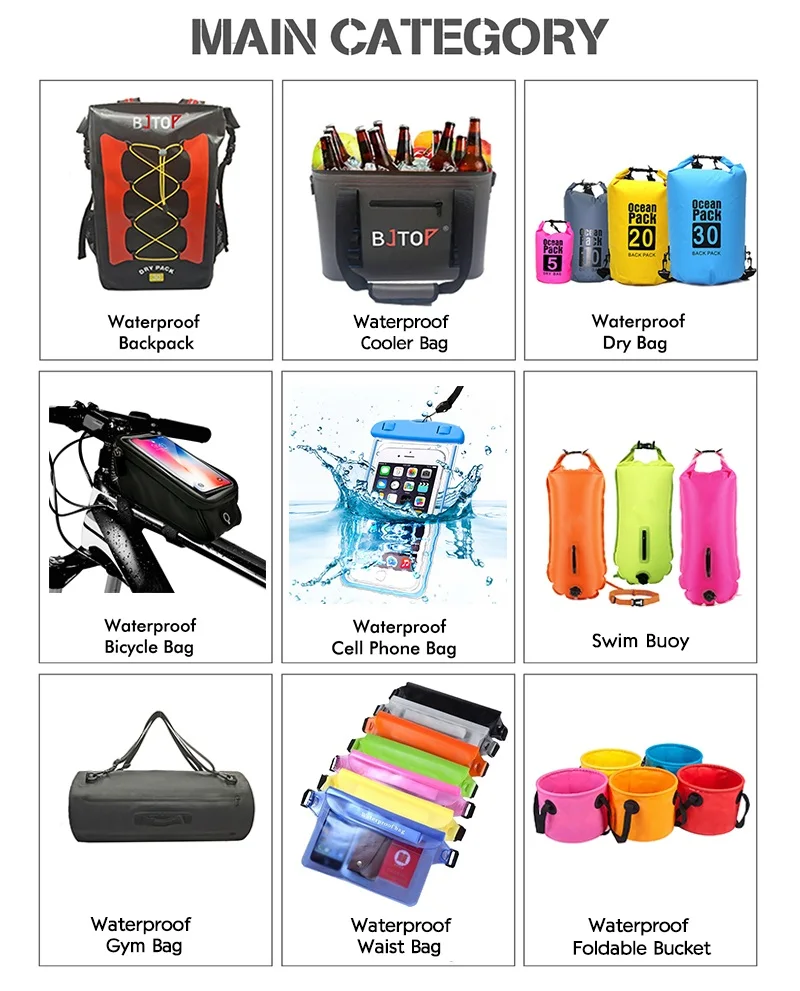 A1:Our main produrts incdude: waterproof bag; waterproof dry bag; wateproof cooler bag; Waterproof Cell Phone Bag, waterproof Pouch; waterproof bike bag; waterproof flat bag;waterproof messenger bags; waterproof waist packs,;waterpoof camera bags; PVC waterproof bag etc. Normally in 250D-500D PVC,PU or PVC materials.