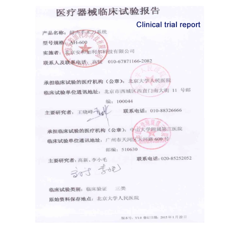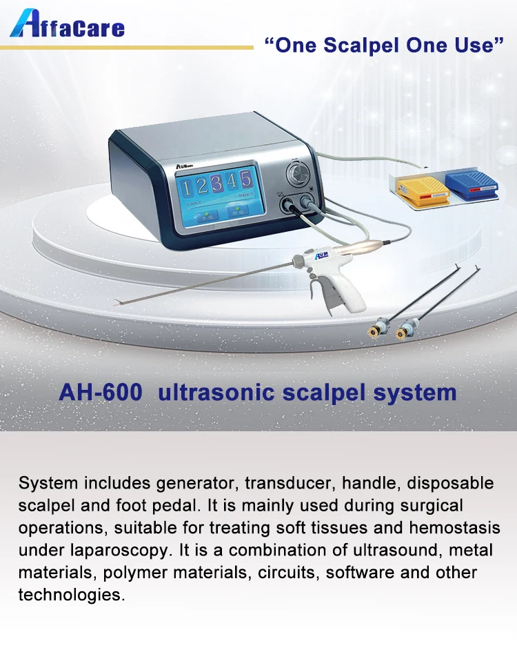 The results of this clinical trial show that the AH-600 ultrasonic scalpel system and the GEN300 ultrasonic scalpel system produced by Johnson & Johnson in the United States have no significant difference in the cutting effect and hemostatic effect of adipose tissue and connective tissue. The two are held and operated in the handle. There was no significant difference in comfort and convenience. There was no significant difference in operation time, bleeding volume, drainage volume and drainage properties between the two groups. No serious adverse events occurred. This indicates that the AH-600 ultrasonic scalpel system is effective in tissue cutting and hemostasis. The ease of operation has reached the international level of similar products, and it is safe and effective for cutting fat and connective tissue and hemostasis in laparoscopic surgery.
