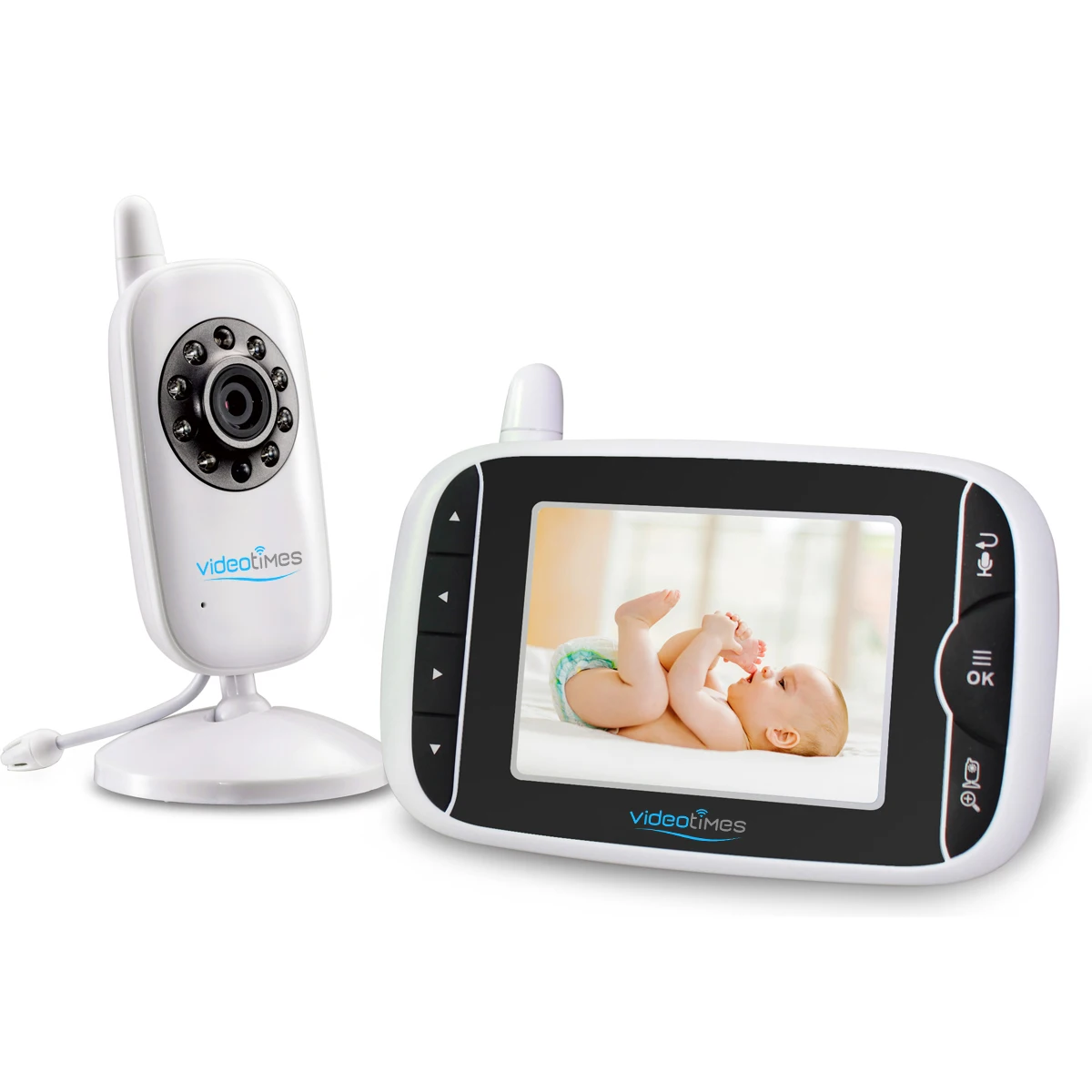 This video baby monitor is equipped with a 3.2 inch TFT LCD display. Application of frequency hopping and digital encryption technology ensures secure and reliable connection.