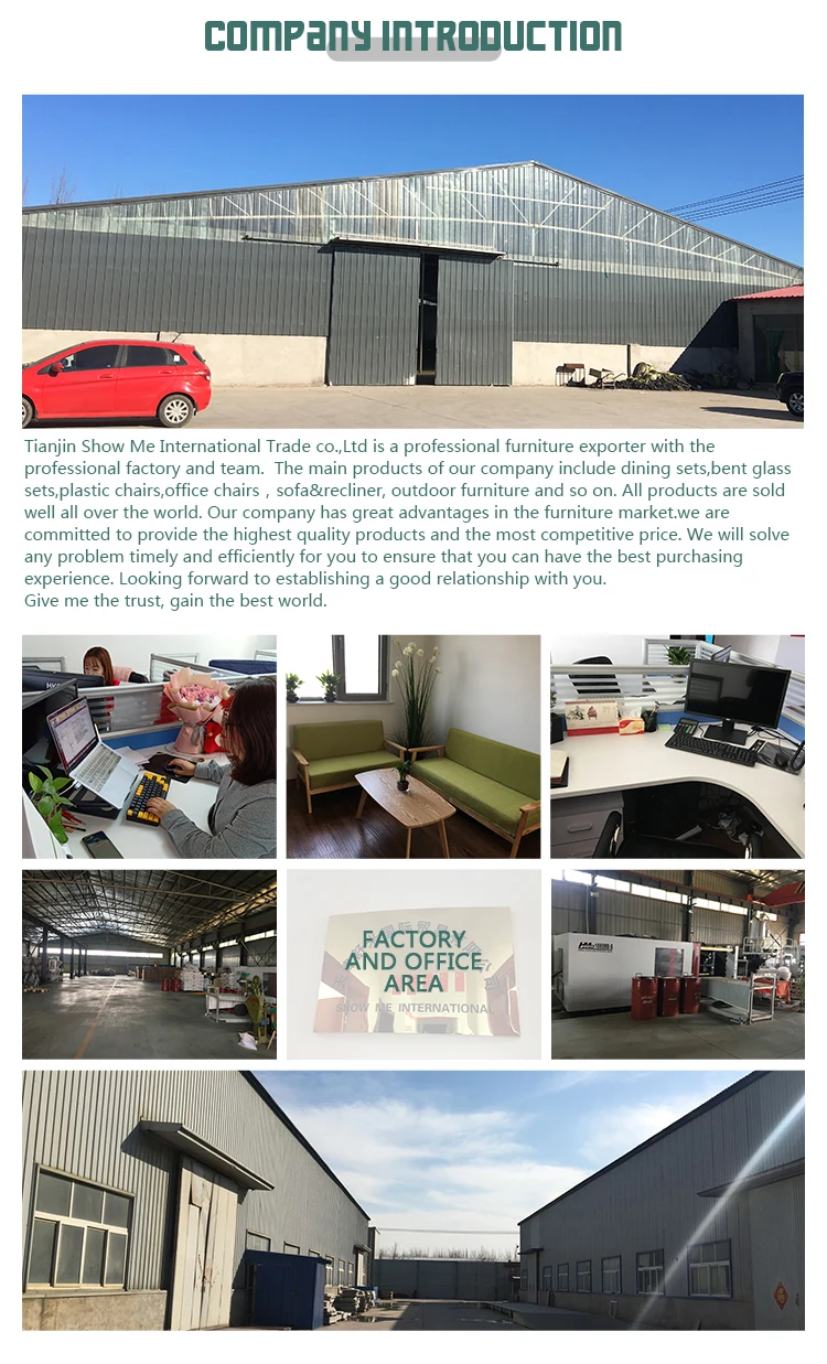 Tianjin Show Me International Trade co.., Ltd. is a professional furniture exporter with a professional factory and team. The company's main products include dining tables, curved glass tables, plastic chairs, dining chairs, office chairs, etc. quality assurance.