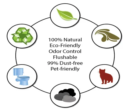 1. 100% natural, harmless when pet swallowed by accident 2. No dust, protects pet respiratory tract. 3. Less track, keeping your home clean. 4. Super Clumping, clump faster and harder than similar products 5. Super absorbency, extra durability. 6. 100% toilet friendly, biodegradable