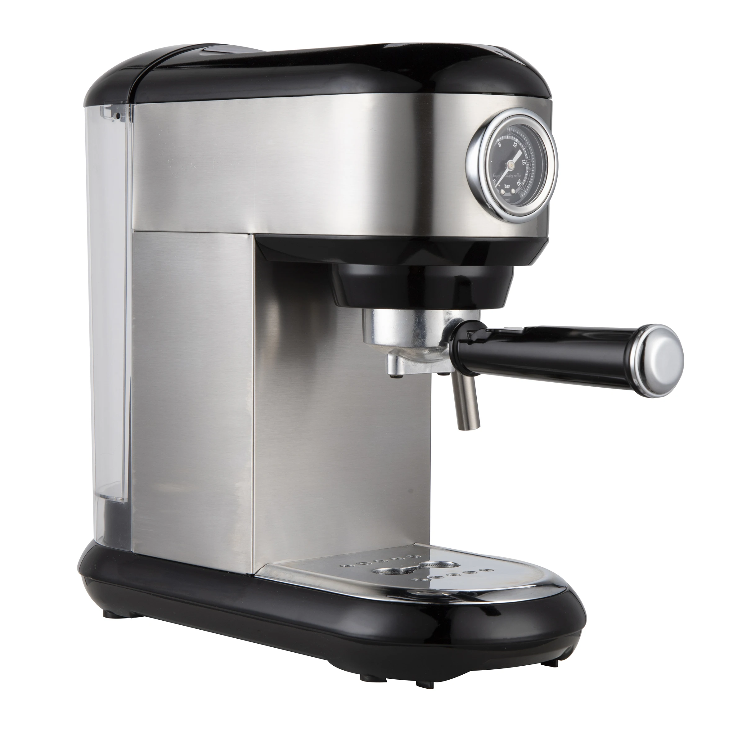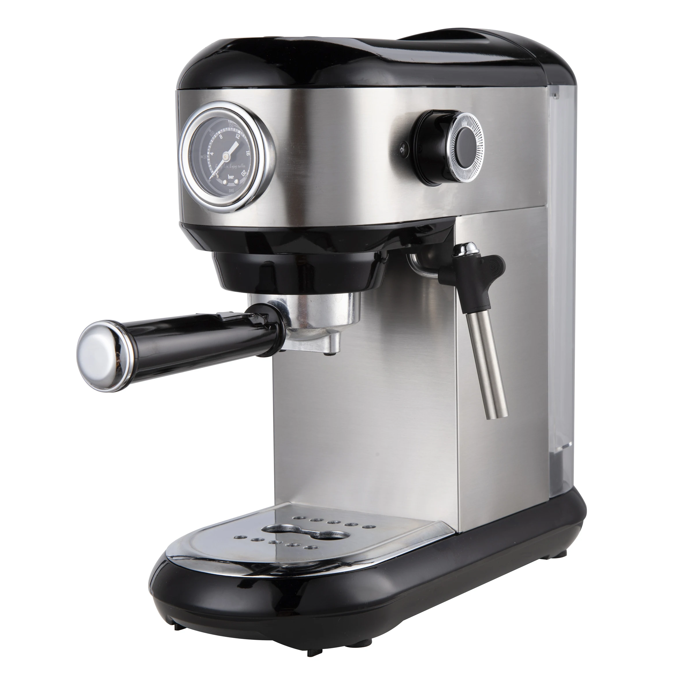 Function Description | 1.Power rating: 1450W. 2.Water capacity: 1 L. 3.Transparent removable water tank. 4. 15bar Pump 5. Pressure gauge show brewing pressure timely 6. Hot water for cup cleaning 7. Steam for milk frother 8. Top warming plate for cup warming 9. One-touch control panel with illumination. 10. Auto shut off / energy saving | Packing Details | Machine size: WxHxD=137mmx295mmx317mm Gift box: 31.5x21.5x32.5cm(White gift box for samples) Carton meas:44.5x32.7x33.8cm 20 feet container: 1300 pcs 40 feet container: 2600 pcs 40HQ container: 2800 pcs QTY: 2 pcs/CTN |