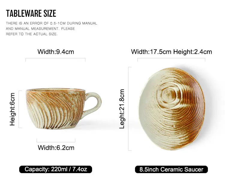 Size: | 220ml Coffee cup (9.4*6.2*6cm) / 8.5 inch Saucer (21.8*17.5*2.4cm) | ||||||