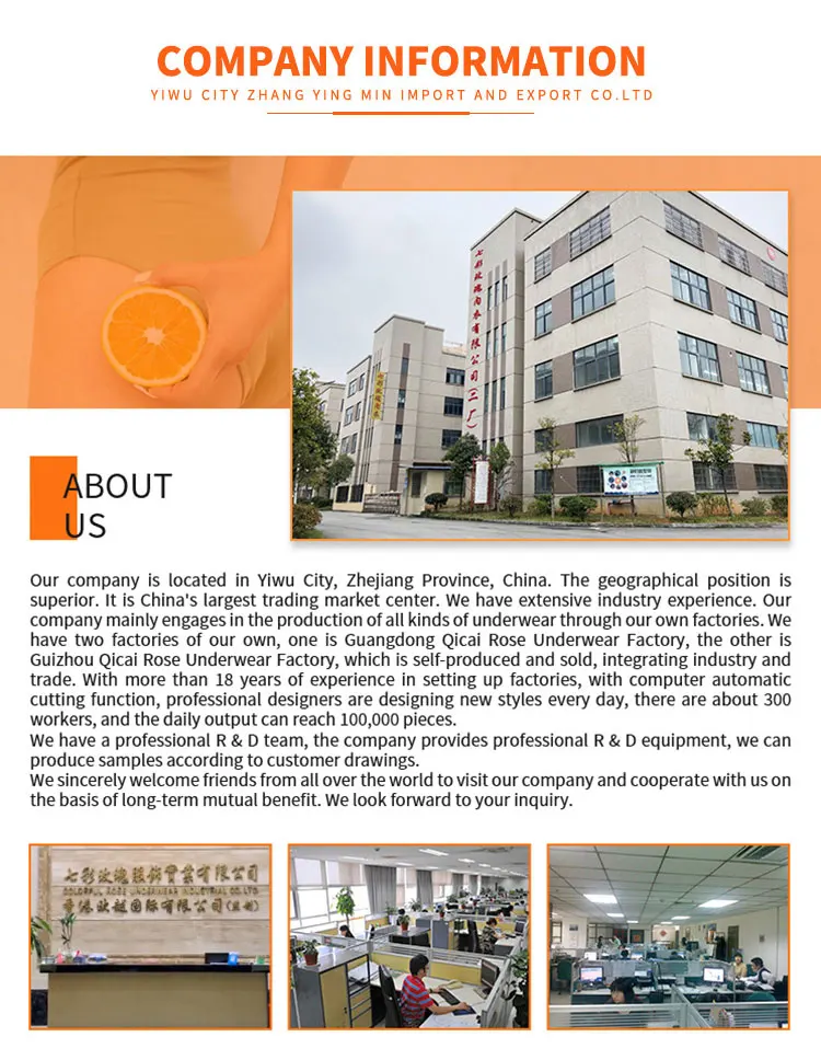 Our company have our own factry,So we can arrange production according to your requirements, Our factory name:ShanTou 7 Colorful Roses Underwear Industry Limited Company. Have 18 years production experience underwear. We are based in ZheJiang, China, star from 2011,sell to South America(70.00%),Central America(15.00%), Domestic Market (10.00%),Mid East(5.00%).There are total about 301-500 people in our office.