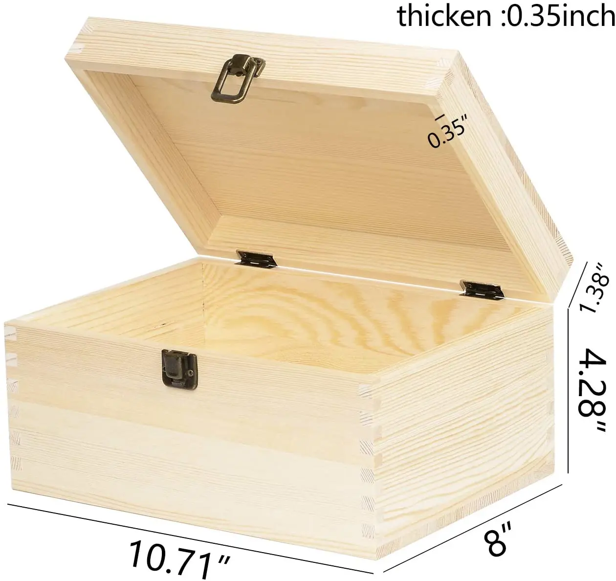 Large Rectangle Unfinished Pine Wood Box Natural DIY Craft Stash Boxes with Hinged Lid and Front Clasp