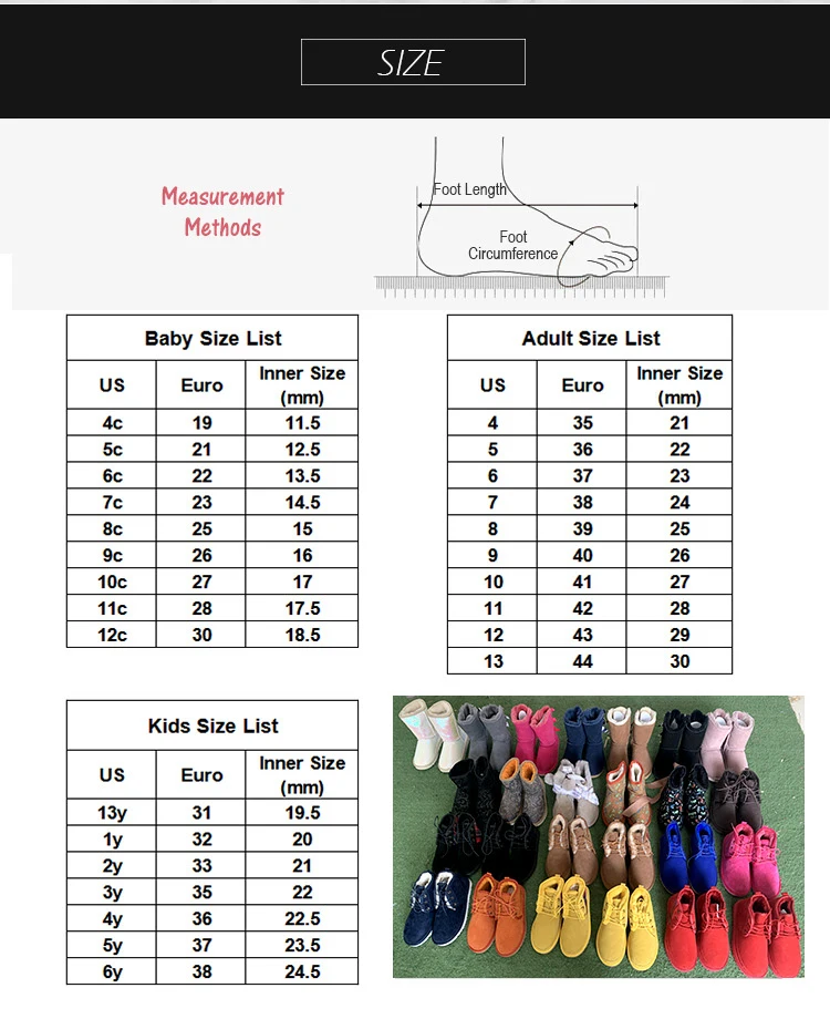 Size | Women :US4-11 Kids:US1 2 3 4 5 6 13 Baby Size: 4c-12c |