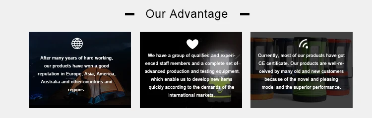 ------What certification do you have? Yes,our products have been tested by CE and ROHS standards. ------Can you provide us the samples of this camping light? Yes,we can send 2 pcs sample for free,but you should pay freight. ------Can we do our own color? Yes,just provide the pantone# of you color,MOQ per color would be 3000pc/set. ------Can we change the packaging? Yes,any packaging is OK.Usually we would give suggestion to our customer which packaging would be the better for this product. ------Can we do our won artwork for packaging? Yes,just send us you artwork,we will send back the printing proof for approval.If you do not have your own artwork,we can design a new one for you.