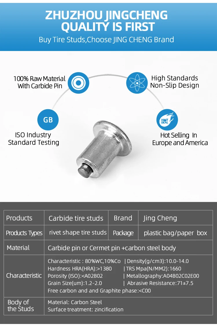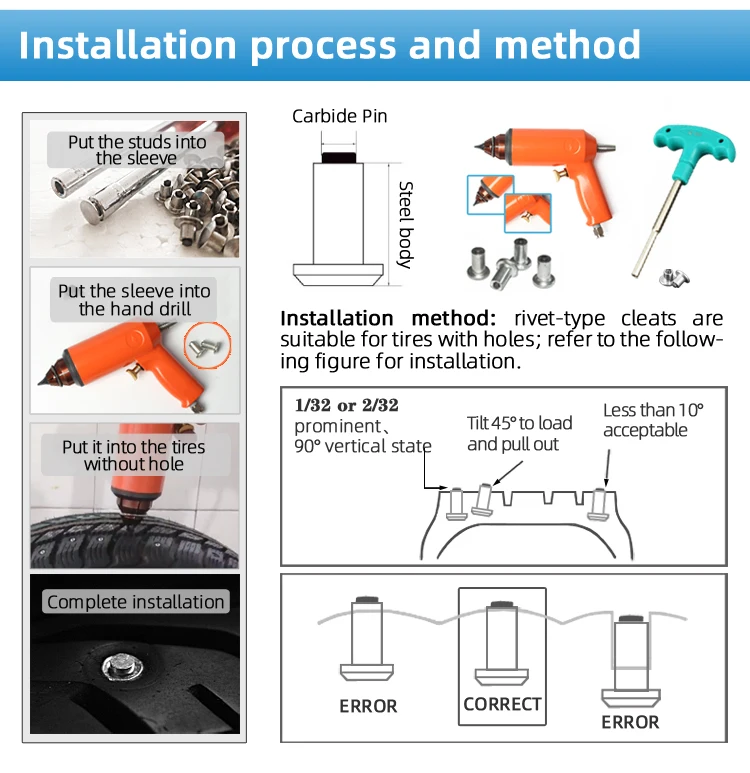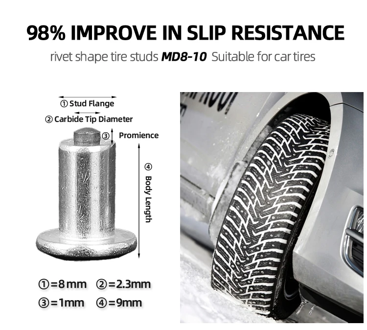 4.ISO standard 5.This new type screw tire studs can be easily installed and removed without professional tools. When it's not in winter, it can also be disassembled from the tire. And you can store these screw tire studs for using again in next season.