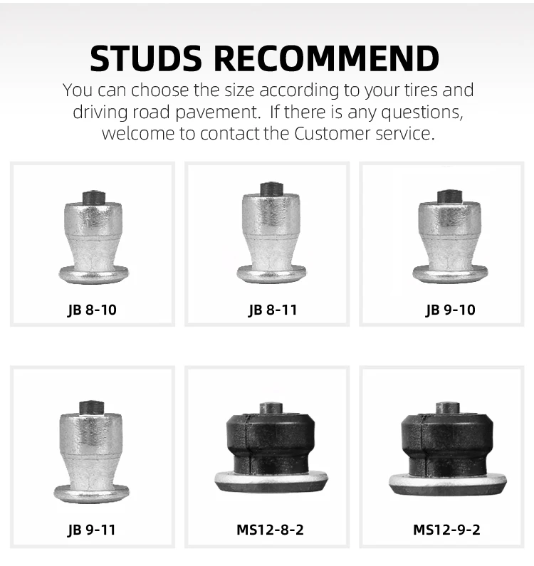 It's important for choosing right size of studs, you must to know the depth on pattern of tread rubber to your tire. The depth must longer than 9mm.