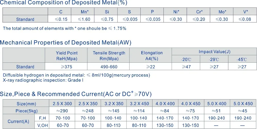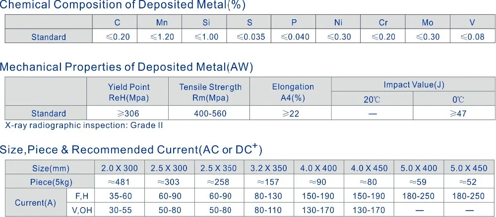 E7018 is an outstanding quality welding electrode covered with extra low hydrogen potassium type coating for high tensile strength mild steels and low alloy steels. Its nominal welding efficiency is about 110% due to iron powder is contained. The weld metal shows an excellent low temperature toughness and high crack-resistance. It is widely used in important projects of ships, boilers, high pressure vessels, bridges, skyscrapers, offshore drilling platforms, nuclear power plants and so on.