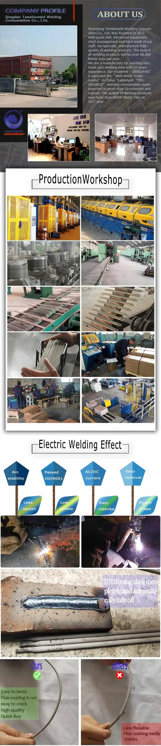 Qingdao Tensileweld Welding Consumables Co., Ltd. Established in 2012, located in Qingdao, Shandong Province, one of the economically developed coastal cities, adjacent to Qingdao port, one of the most important ports in China, with extremely superior geographical location and convenient transportation. We are the professional manufacturer of welding electrode and welding wire.