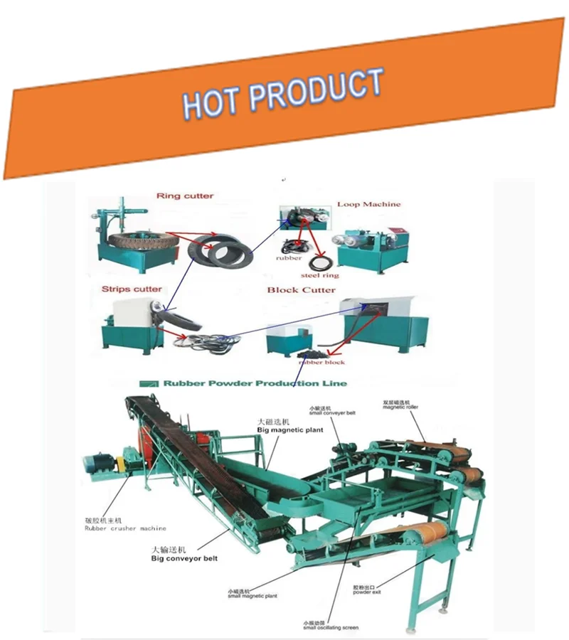 Our company produces a full set of waste tyre recycling machine, which is used to make rubber powder from old tyre, like rail tyre, engmeenng tyre and other old tires. It can produce 20 - 80 mesh rubber powder.