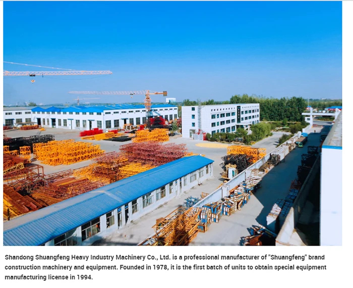 Shandong Shuangfeng Heavy Industry Machinery Co., Ltd. is a professional manufacturer of "Shuangfeng" brand construction machinery and equipment. Founded in 1978, it is the first batch of units to obtain special equipment manufacturing license in 1994.The company has strong technical force, advanced detection means and perfect quality assurance system. It mainly produces tower cranes of various specifications, such as QTZ31.5, QTZ40, QTZ50, QTZ63, QTZ80, QTZ125, QTZ160, QTZ315, flat head cranes, SC200/200, SCD200/200 series construction lifts, SS80/80 (WJ80/80) series material lifts. Machine, JS and JZ series concrete mixer, PLD series concrete mixer, concrete mixing station, stabilized soil mixing station, dry mixing mortar equipment, cement silo, transmission line tower, concrete pump, mortar pump, automatic hollow brick making machine, small loader, mortar machine, castings and various gear boxes, a total of 15 series of more than 100 Species of products.All products have passed the ISO 9001 quality management system certification. The products sell well in nearly 30 provinces, municipalities, autonomous regions and more than 50 countries and regions in the Middle East, Europe, North America and Africa.Our company has always adhered to the goal of winning the market by quality, developing by science and technology, actively developing product quality tracking service, and striving to develop new products, so that the product quality is more reliable and the structure is more reasonable. We warmly welcome new and old friends from all walks of life to our company for consultation and negotiation.