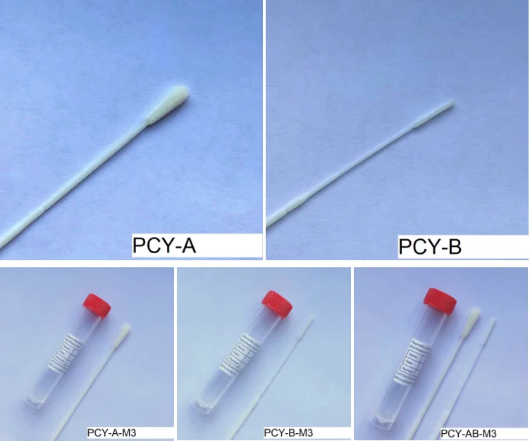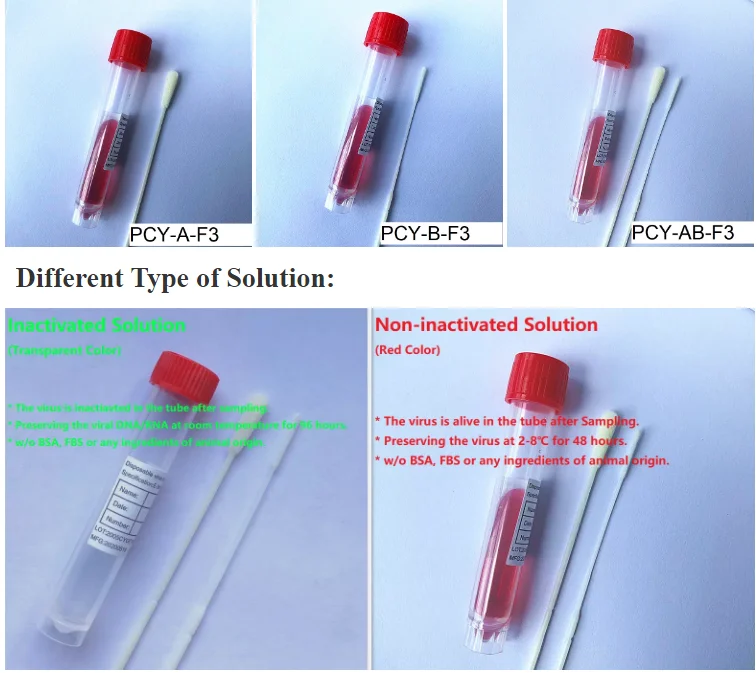 PCY-A-F3 | 1*Throat Swab,1*Tube with 3ml Preservation Solution (Non-inactivated Medium) | 1.Swab length: 15cm or customized 2.Swab breakpoint: 3cm& 8cm 3.Preserving liquid: Non-Inactivated | |