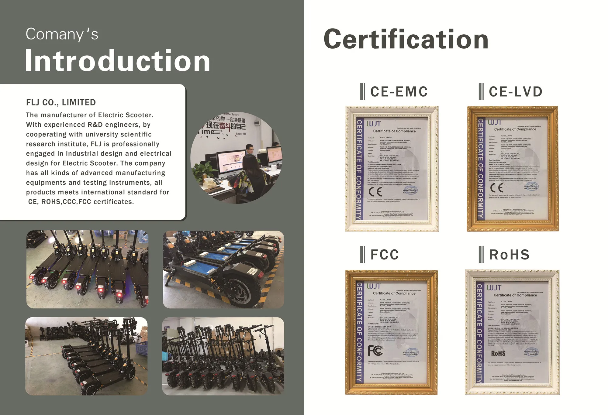 FLJ Company is professionally engaged in industrial design and electrical design for Self Balance Scooter which has all kinds of advanced manufacturing equipments and testing instruments. With experienced R&D engineers, by cooperating with university scientific research institute, applied 8S management and ISO9001:2008 system; all products meets international standard for CE, ROHS,CCC.
