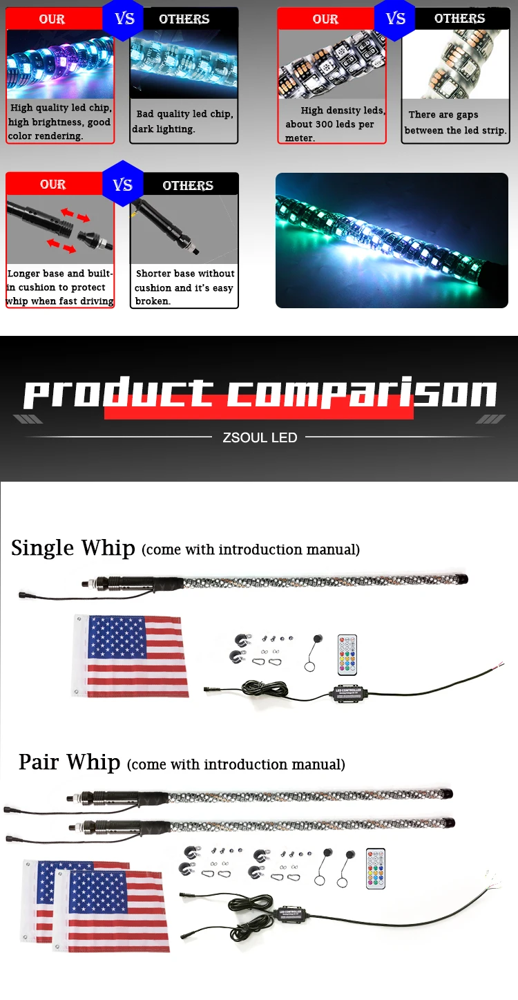 Packing Accessories | Single whip: 1 whip + 1 flag + 1 control box + 1 remote + flag mounts Pair whip: 2 whips+ 2 flags+ 1 control box + 1 remote + flag mounts |