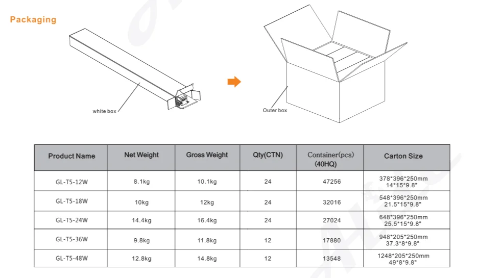 Model | GL-T5-8W | GL-T5-12W | GL-T5-18W | GL-T5-24W | GL-T5-36W | GL-T5-48W |