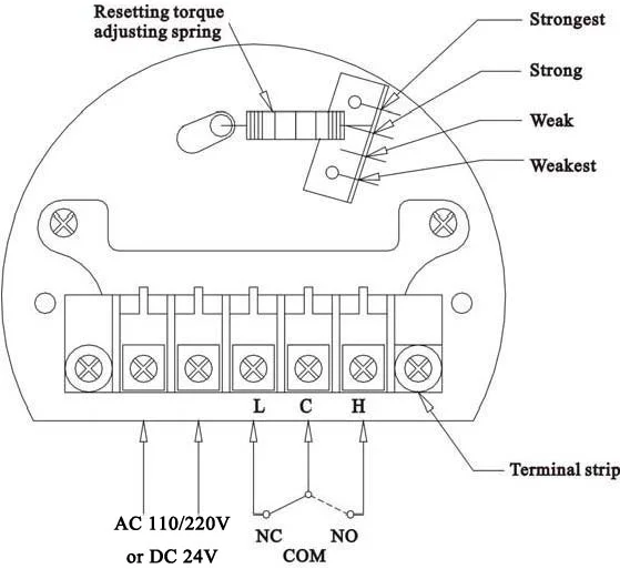 The torque spring is applied to adjust the output torque of the shaft, which is set at “weak” position at factory, it is adjustable for target measuring material S.G.(special gravity), if the measured material with higher S.G., please try to release it to more stronger spring force position until you found the proper orientation. The paddle sensitivity will be interacted by weaker, otherwise, the low S.G. material will release torque spring to the weakest position, which will cause the paddle performance to be more sensitive. Note: the torque force should not be adjusted during test, avoiding the error check signal.