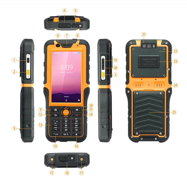 1:Power button | 2:Scan button | 3:MIC | 4:Barcode scanner(optional) |