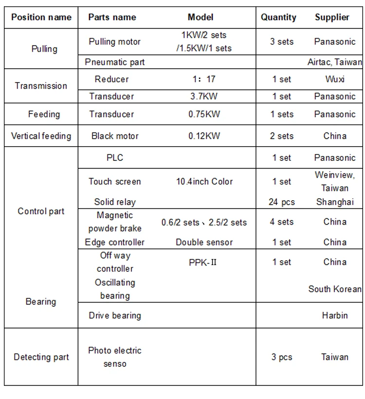 * Function: Three-side sealing & Double zipper Standing & Standing Bag * Main Electric Device: Three Servo Motor, Panasonic PLC, AC motor masterdrive, Panasonic frequency converter, Temperature control 24 Road, Tension control unwinding. * Base material: two-layer or multi-layer three-side sealing laminated film pouches with zipper sealing and doy-pack making function which take BOPP, PET, CPP, PE, nylon, aluminum foil and paper as base material. * Max working speed: 180 times/min * Max unwinding line speed: ≤45 meter/min (subject to base material) * Making bag size: length (500mm), It adopts times to send when the length is more than 500mm. (Max times to send is nine) * Max width of bag: 80-600mm * Bag paste width:6-60mm * Max size of roll material: φ600×1250mm(Diameter×Width) * Location precise: ≤±0.5mm * Heating sealing knife quantity: 2 set Longitudinal Knife, warming and cooling up and down. * 5 set Longitudinal Knife, warming and cooling up and down. * Transverse Knife: 3 set warming up and down. 2 set cooling up and down. * Transverse sealing adopts ultrasonic welding zipper head. * Temperature electric heating quantity: 22 piece. * Temperature range: 0~300℃ * Total Power: 60Kw (Starting power is about 45kw, in condition of keeping warm, power is about 35kw) * Overall dimension: 12500×2400×1950mm(L×W×H) * Net weight: About 7000 kg * Machine steel plate thickness: 10mm (Made in Shanghai, Baosteel) * Control system Model: Japan Panasonic PLC Laminating Film High speed bag making machine control system