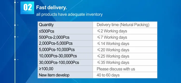 A: If we have stock and you accept neutral packaging or our packaging, the goods will be delivered within three days after your payment. If the quantity you need exceeds our stock, our usual delivery date is 10 to 15 days. But if your order is very large, we need to negotiate the delivery date in advance.