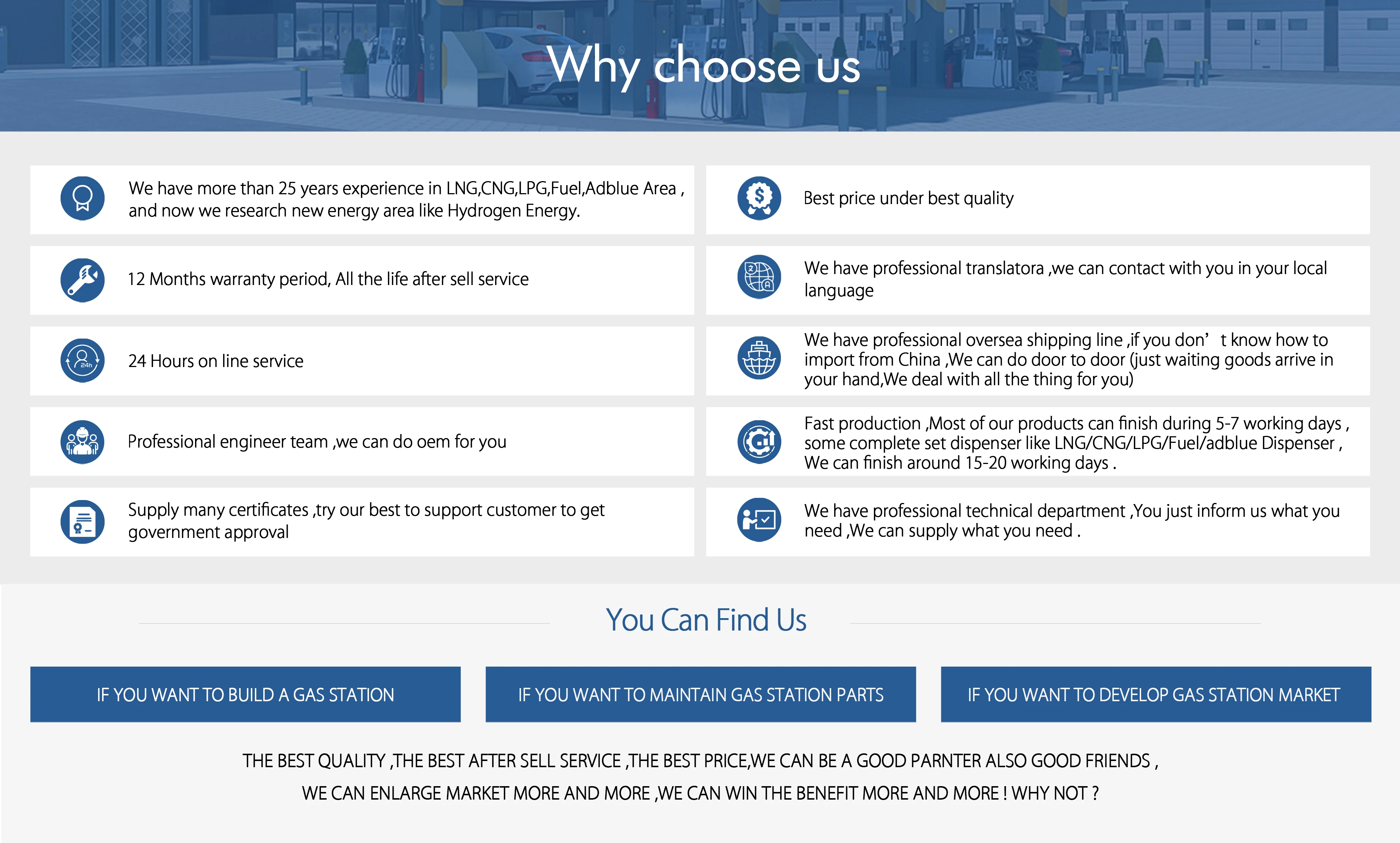 A4:We are the gas station equipment supplier inLPG,CNG,LNG,FUEL area, we have doing business with more than 98 different country customers over the world. we can supply best