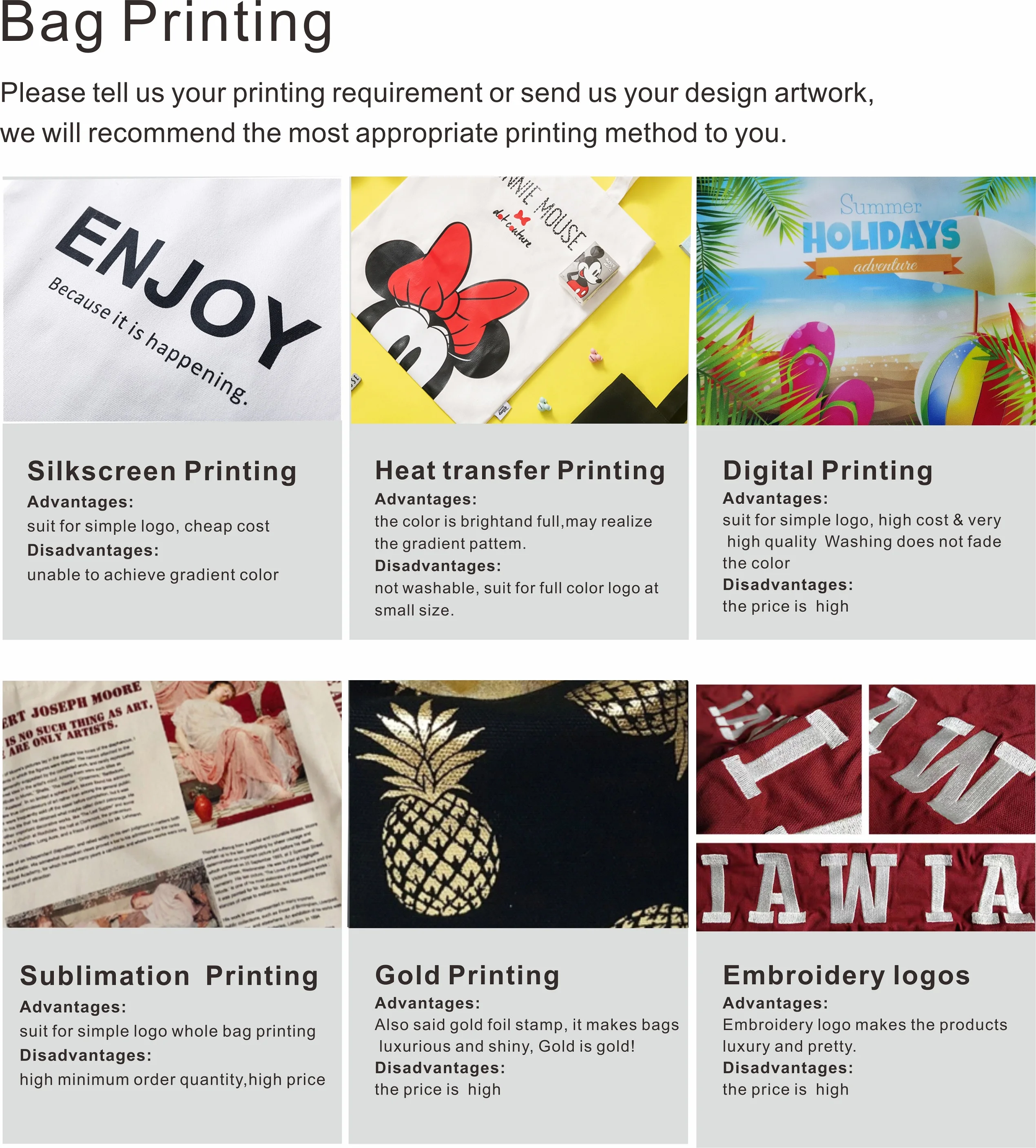 Printing | silk screen printing, foil bronzing and heat transfer printing, Thermal sublimation printing, Digital Printing, etc. | |