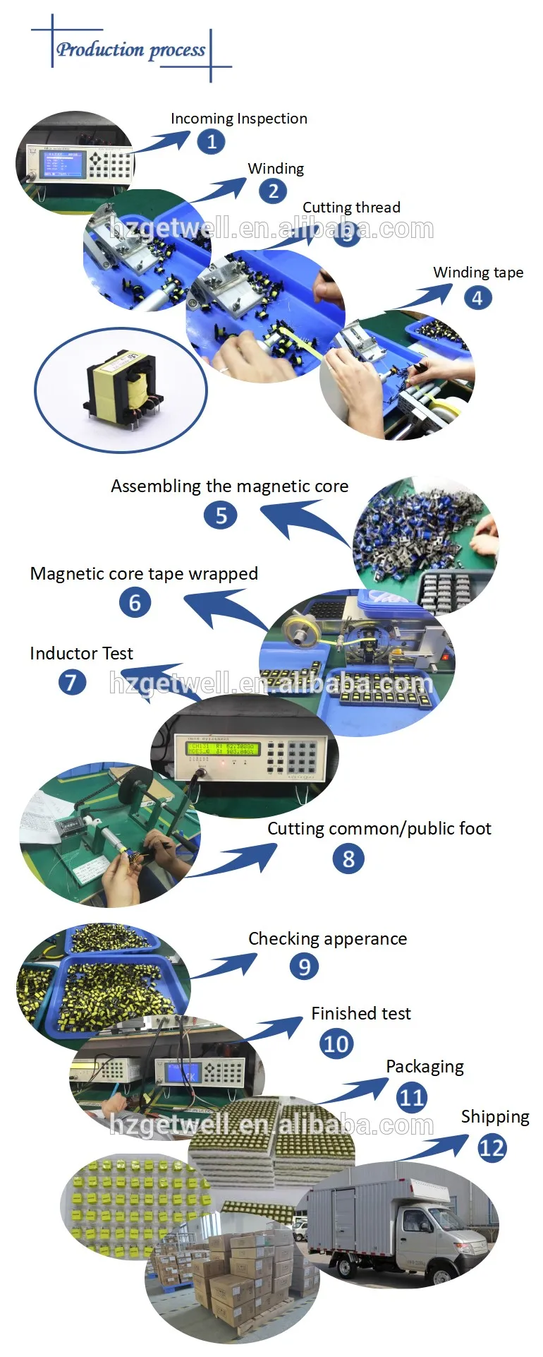 Getwell Electronics (Huizhou) Co., Ltd., which belongs to the Sino foreign joint ventures, with independent import and export rights, is specialized in manufacturing various inductance, coil, anti interference suppressor, beads, smd power inductors and other electronic components; with 10 years of professional production technology and management experience, with perfect production equipment and testing equipment. Main production equipment: color coded inductors automatic painting line, automatically connect to production line, bead core automatic production line, SMD taping machine, CNC winding machine. Main instrumentation: HP4285 and HP4286a, HP4342a and HM9480, HM9481, HM9461,CH100, CH102 and so on.