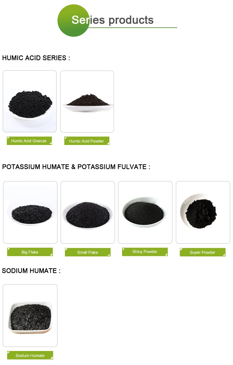 | Potassium Humate Shiny Flake/Super Powder | 60-70% | 8-16% | 95% | Powder: 80-100mesh Flake: 1-2 or 2-4 or 3-5mm |