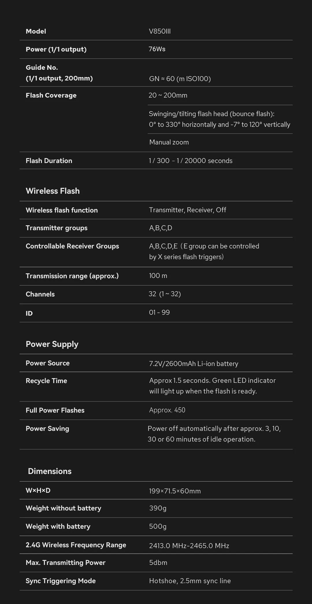 | Full Power flash times: | Approx.650 times |