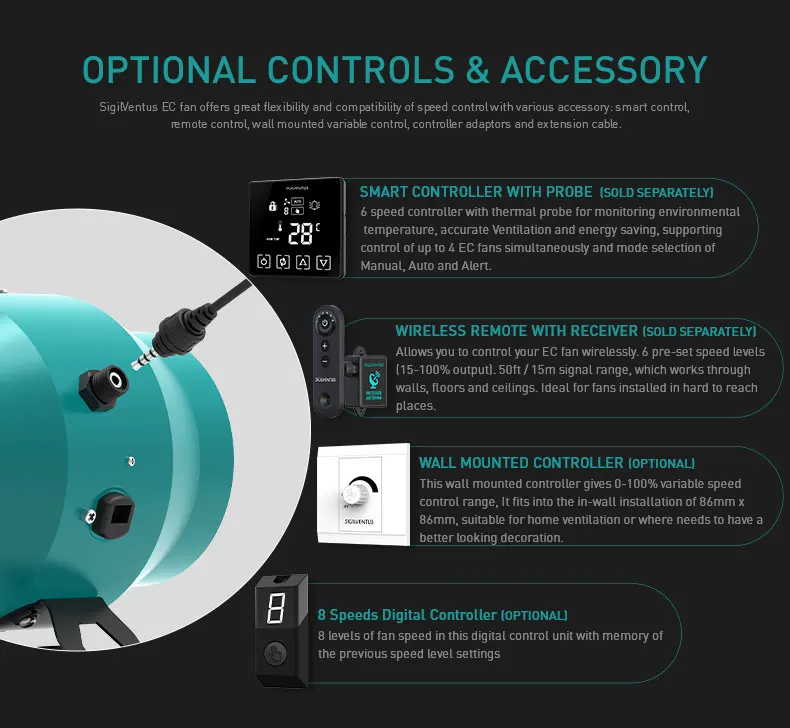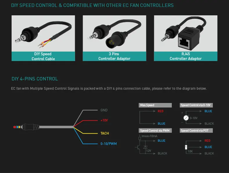 control our products with various ways. 8 level speed control match all the speed demands and thermal controller ensure the 24 hours auto using.