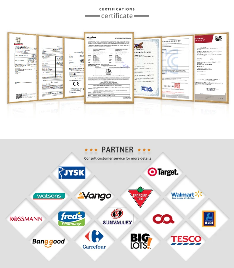 Q: Do you have relevant cerifications? A: Yes, we have CE, RoHS, FCC, UL and IPX7.