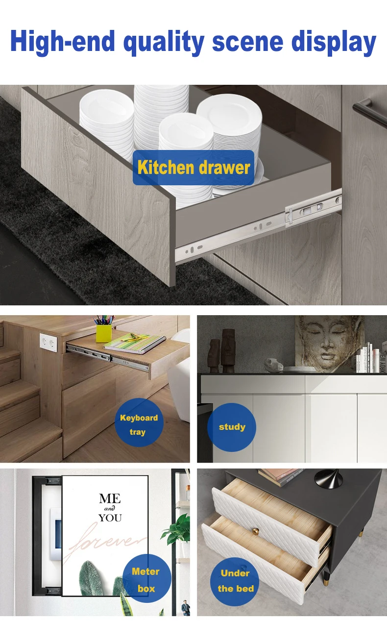 Features: 1. Double spring, play the role of buffer closing force 2. Damping buffer, slowly closed, to achieve the mute effect 3. Buckle design, closed to a certain position will automatically shut down 4. Fixed card slot, lock slide, avoid drawer automatically open 5. Can be used in the kitchen, bathroom. Balcony and other wet places. stainless 6. Double solid steel ball, drawing smooth, strong balance