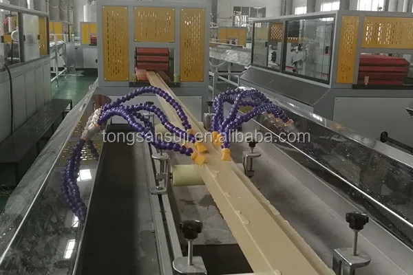 wood-plastic door profile extrusion line mainly use PVC+wood powder to extruder wood-plastic profile such as building partition, cabinet door panels, window sill, skirting board, door edgeline, door jamb, window shutters, photo frame, mirror frame, furniture edge banding, door frame, door pocket, window pocket, column profile, stair handrail, floor board, decoration cladding panel, furniture, WPC pipes, etc.