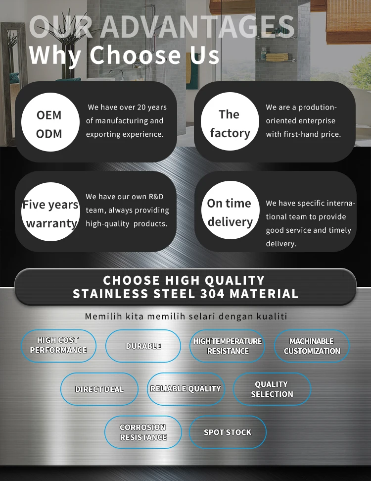 2. Stainless steel raw material thickness 0.4~1.2MM and high quality accessories; | |