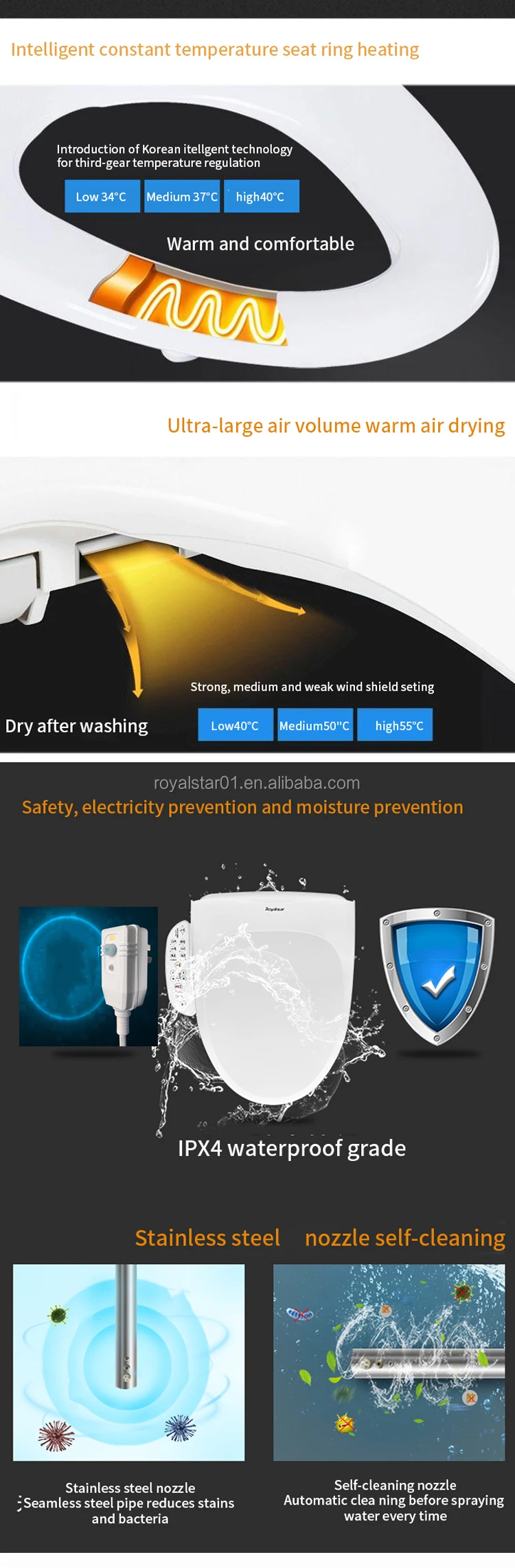 Q: What is electronic bidet? A: It is an electronic bidet seat that attaches to your existing toilet bowl. It replaces your existing toilet seat and has a number of functions including warm seat, soft seat, self cleaning, seat sensor , energy saving ,warm air drying ,massage, and deodorization.