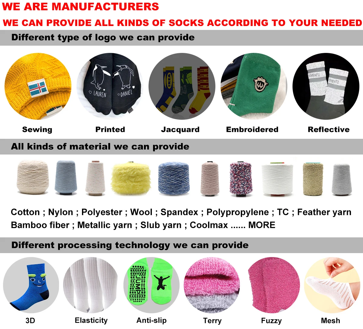 Sample Time and Bulk Time: | Small orders lead time: 5-7 workdays; Bulk Time: 3-6 Weeks.Can arrange more machines to produce socks for you if you are in a hurry. | |